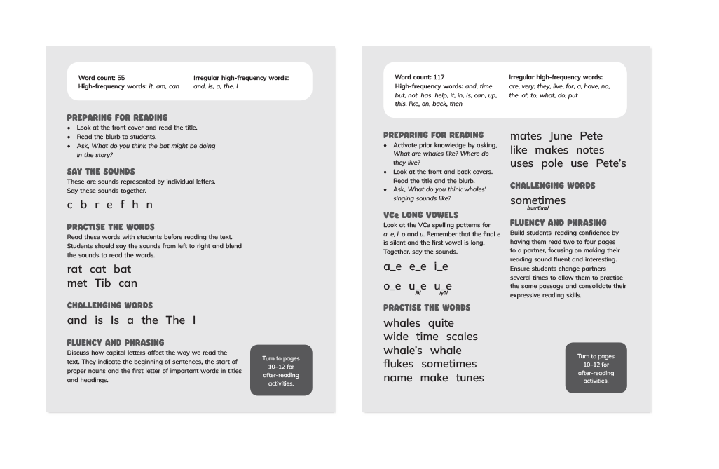 Nelson Decodable Readers include a range of engaging fiction and non-fiction texts in every set. Tightly controlled decodable vocabulary and the careful inclusion of high-frequency words support the sequence of phonemes and graphemes taught. Each book includes pre-reading and post-reading activities, including comprehension questions (literal and inferential).