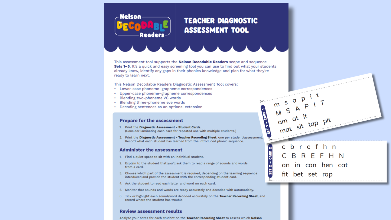 - Use our Teacher Diagnostic Assessment Tool to easily gauge your students' current reading skills and plan their next steps. This free downloadable resource tests what students already know, identifies reading gaps and aligns them with the appropriate stage in the Nelson Decodable Readers scope and sequence.